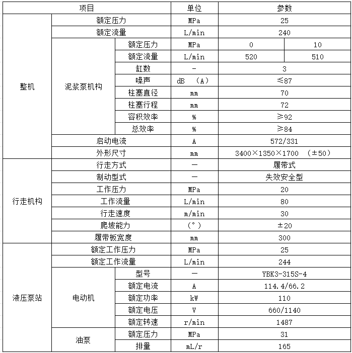 BLY510/10矿用履带式泥浆泵车(以下简称泵车)是一款煤矿用大流量泥浆泵车,主要配套大扭矩千米定向钻机使用,将泵车操作台、泥浆泵、蓄能器、电机油箱等集成到钻机主车之外的另一履带底盘上,运输和使用灵活方便。