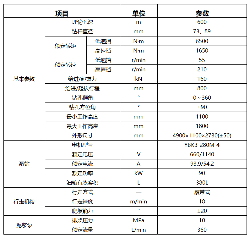 3、钻机整机宽度最小可达1100mm,并将高压泥浆泵集成在主车上,适用于中小煤矿狭窄巷道运输和定向钻进施工。能快速实现巷道迎面与巷道全断面±90°方位角的移机锚固,具备掘进迎面钻孔、底抽巷全断面钻孔等定向钻进施工的功能;