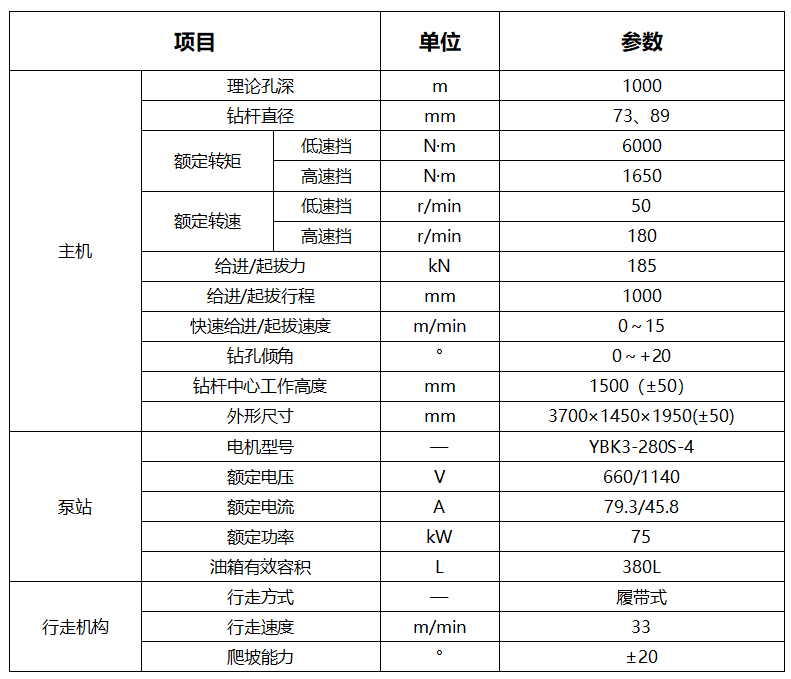 2、钻机给进机构起拔力大,大大提高了在施工过程中处理抱钻、卡钻等事故的能力;